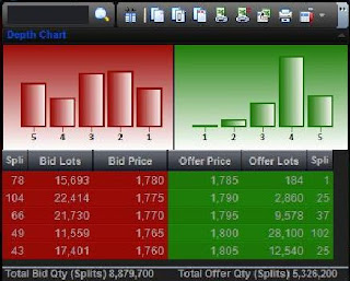 Gambar diatas menunjukkan sistem antrian saham di pasar modal. Di situlah Anda bisa melihat fraksi harga. Setiap sistem selalu menunjukkan fraksi harga. Misalnya, saham PWON. Lihat Bid Price, ada harga 457, 458, 459, 460, 461. Kenaikan dari 457 ke 458 itu yang namanya fraksi harga. Seperti tabel diatas tadi, semakin besar harga saham, fraksi harganya akan semakin besar juga.