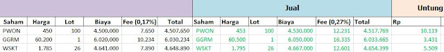 Misalkan Anda membeli saham PWON di harga Rp450 sebanyak 100 lot. Selain beli saham PWON, Anda juga beli saham GGRM di harga Rp60.200 sebanyak 1 lot dan membeli saham WSKT pada harga Rp1.785 sebanyak 26 lot. Lihat tabel dibawah ini (klik untuk memperbesar).