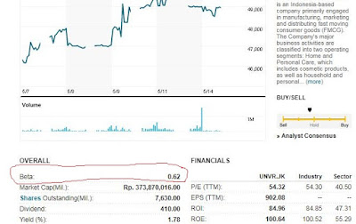 Anda bisa melihat beta saham UNVR sebesar 0,62. Ini artinya UNVR termasuk dalam emiten yang beta sahamnya dibawah 1.